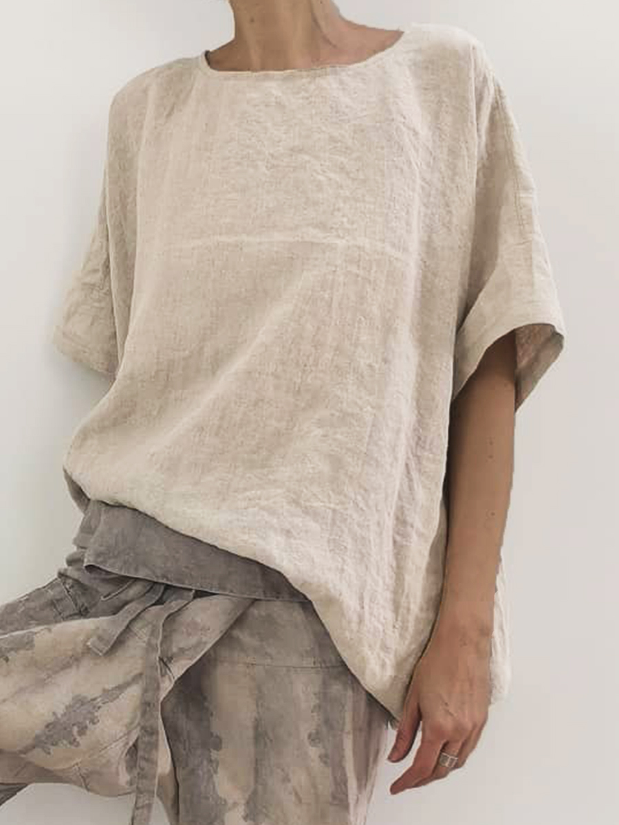Retro Solid Color Cotton and Linen Short-sleeved Top
