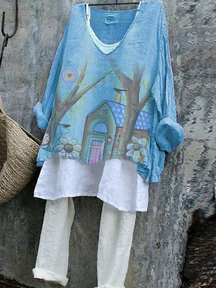 Vintage V Neck Dandelion Printed Casual Top