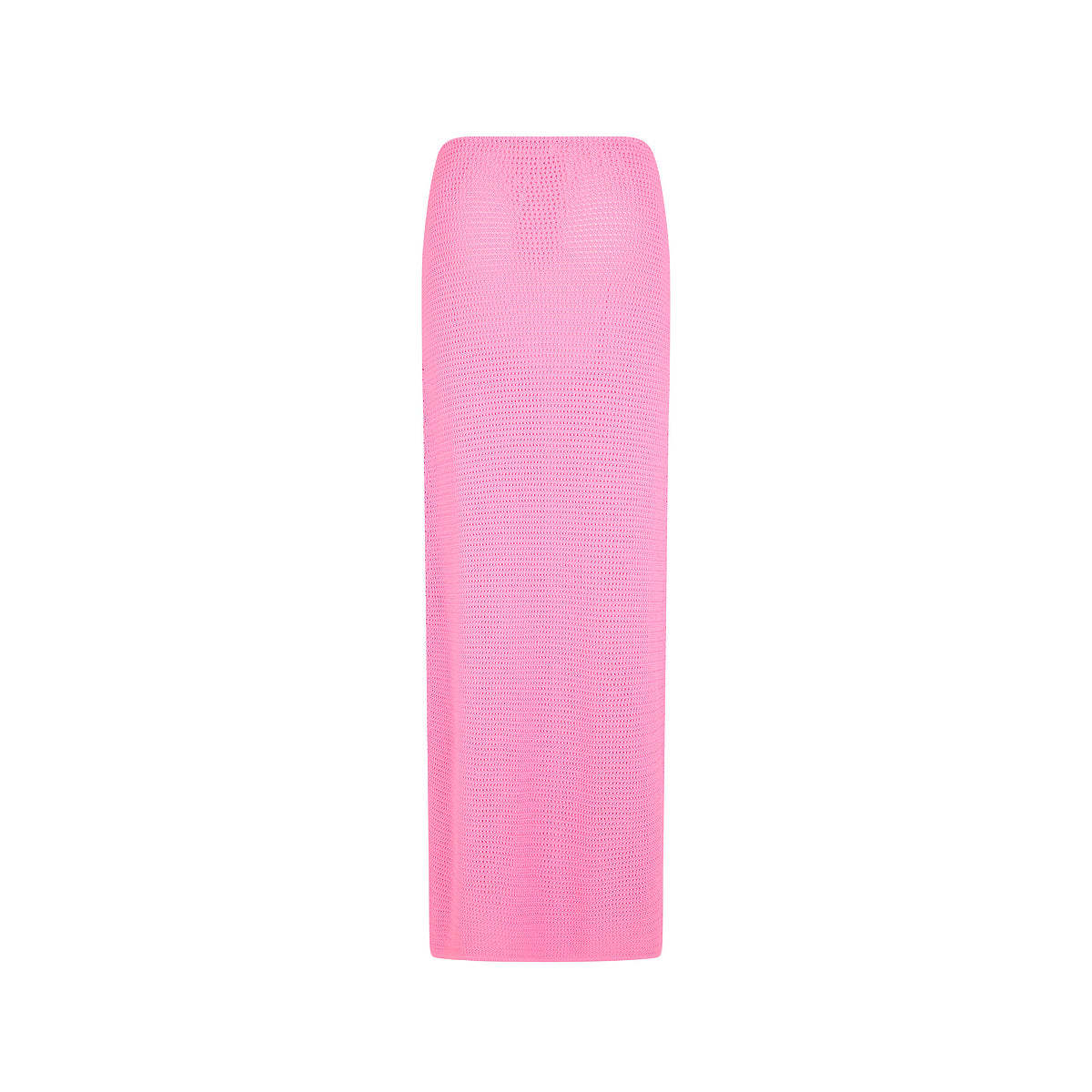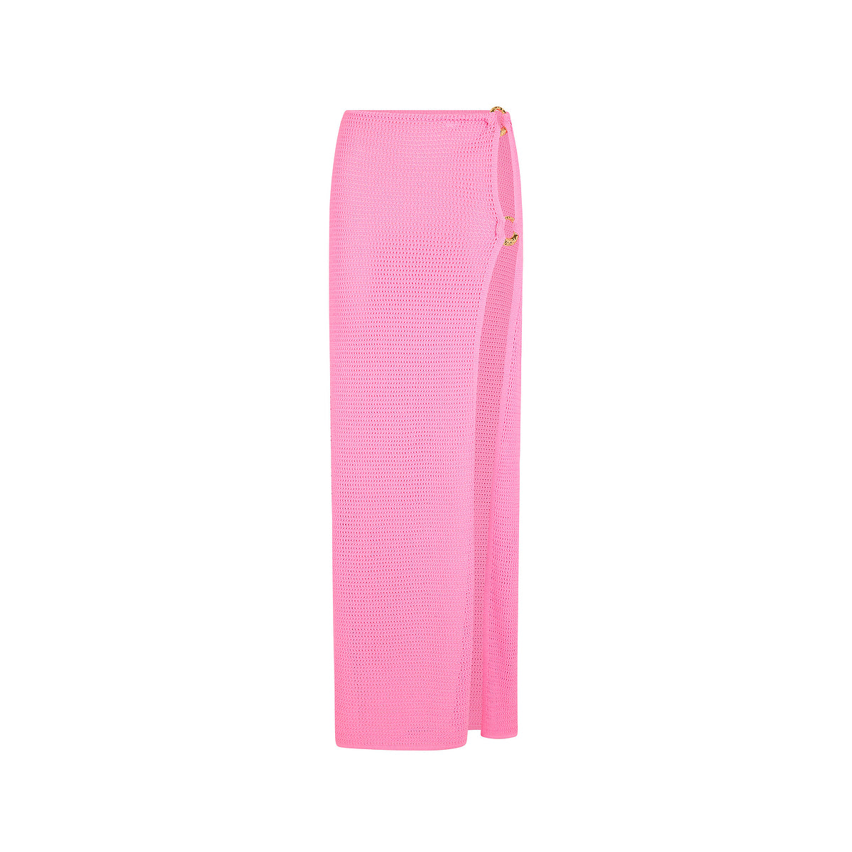 A true statement piece, this knit maxi skirt features a dramatic side split secured with hammered gold rings for a bold finish. With minimal coverage and a semi-sheer knit fabrication, it can be worn as a daring skirt or layered over swim for a standout beach-to-bar look.