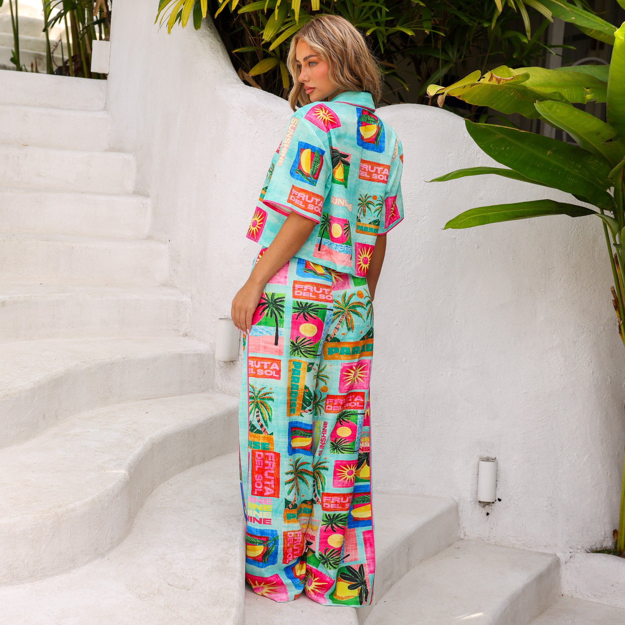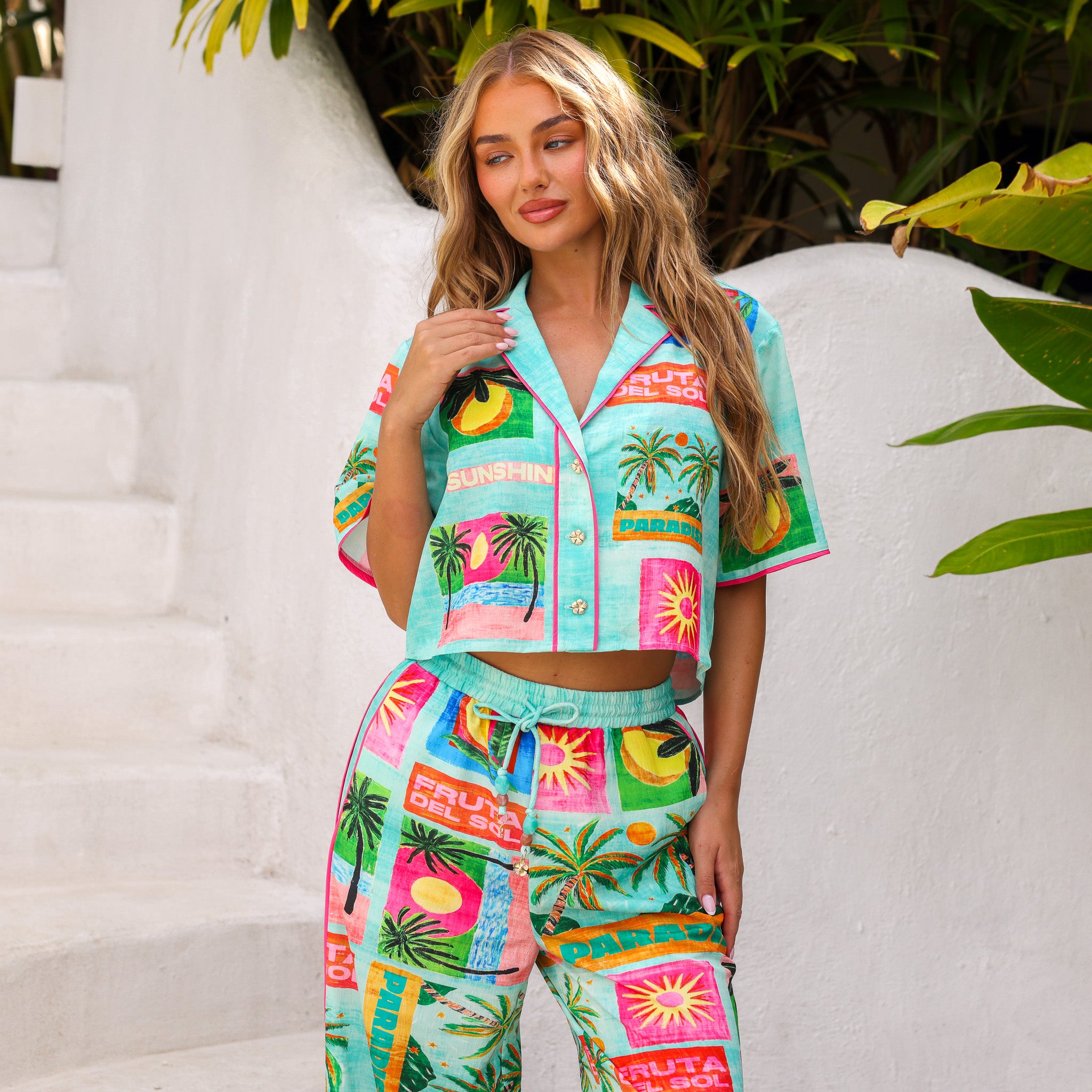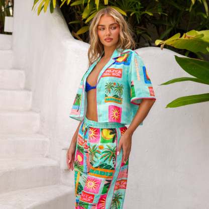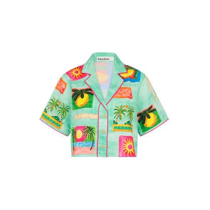 Your ultimate warm-weather statement shirt. The Short Sleeve Summer Shirt features a cropped silhouette with playful piping, hibiscus gold buttons, and a placement print that brings instant summer energy.